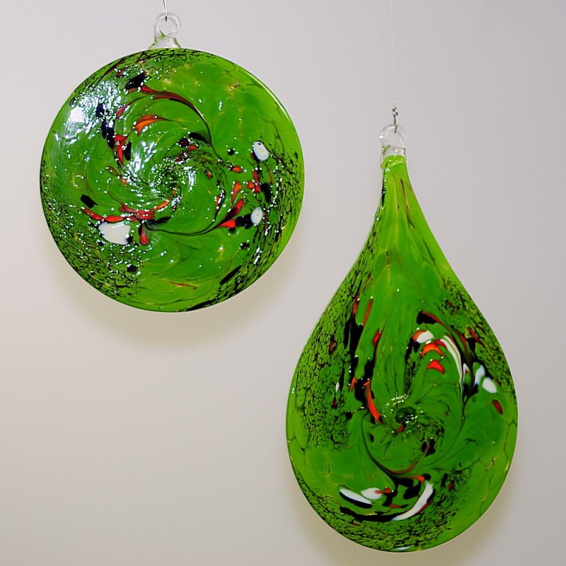 Dekorscheibe moosgrün Ø 11 cm, mit farb. Einschmelzungen, Glasmacherarbeit