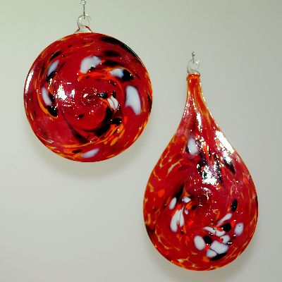 Dekortropfen und Scheibe, tomatorot Glasmacherarbeit Tropfen 18 cm und Scheibe Ø 11 cm, mit Einschmelzungen,