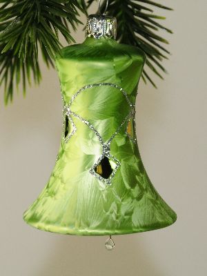 Glocken 5 cm, Eislack mindgrün, Würfelm. Silberglimmer 4 Stück, d 5 cm, freigeblasen