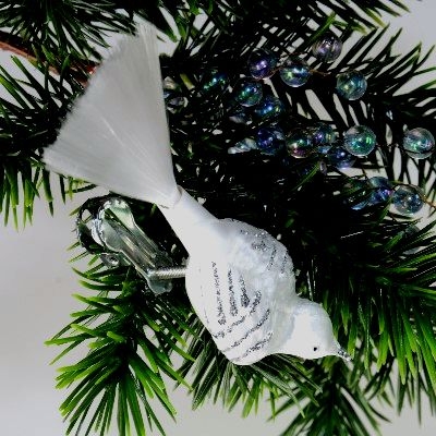 6 cm kleiner breiter Vogel, Eislack weiß, Glasschwanz L ca.11 cm
