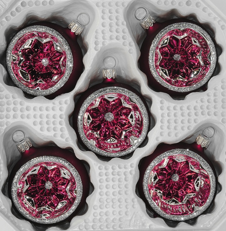 Reflexkugeln 6 cm, weinrot matt, silbernes Tropfenm. 5 Stück, Ø 6 cm Reflex mit rot und silber